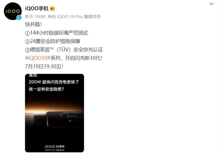 关注骁龙8+新机的朋友,一定都了解到iQOO将于7月19日发布iQOO 10系列,并且带来200W快充的首发商用,很可能将充电时长缩短至10分钟。看来,留给大家打盹、洗漱的时间又变少了。那么,iQOO 10系列除了200W快充,还有什么值得关注的亮点吗?