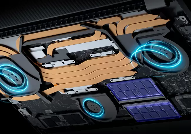 由于采用了NVIDIA® GeForce RTX™ 3070 Ti 笔记本电脑GPU、AMD 锐龙 9 6900HS处理器等高性能硬件,ROG幻16翻转版在散热规格上同样迎来重磅升级。全新冰川散热架构3.0,散热能力再度升级,核心区域采用热传导效率一流的暴力熊液态金属导热,五根热管下方覆盖薄至0.1mm的冰翼鳍片,Arc Flow风扇数量也升级至3个。在ROG智能降噪技术的调控下,低功耗时ROG幻16翻转版自动启用被动散热,营造沉浸静谧的使用环境。