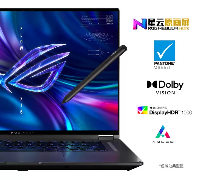 作为全能王者,ROG幻16翻转版的显示素质同样处于同类产品第一梯队。其采用的16英寸Mini LED翻转触控屏,拥有多达512个分区背光,支持DisplayHDR 1000,高达5400Hz的PWM调光,和1100尼特峰值亮度。同时拥有2.5K分辨率、100% DCI-P3色域、165Hz刷新率,密集的像素点与高色域高刷新率组成的三叉戟,可实现高细腻度、高色彩覆盖率以及高流畅度,设计、娱乐体验拉满。而Pantone色彩认证、Free Sync技术的加入,还可保证色彩准确,画面显示无撕裂。其适配了ASUS Pen及支持MPP2.0技术的触控笔,还可实现笔电、平板、游戏、分享四模式切换。不管是作为一块创作靓屏,还是“竞技沙盘”,这块面板均可给予旗舰级显示效果。