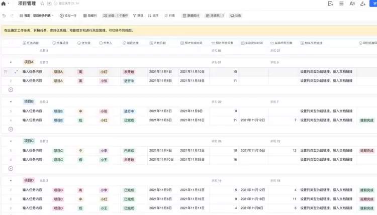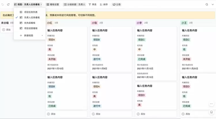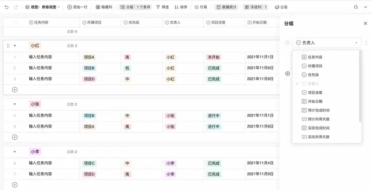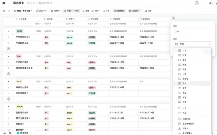 不仅如此,智能表还可以通过「分组」功能,按需将信息以所属项目、优先级、负责人等不同条件,对选中的列进行分组展示,让协作者对信息有更全面的掌握。另外,智能表的「视图」功能,可以在同一个智能表中切换表格、看板、画册、甘特等不同视图,使用户能够从不同维度把控数据,实现信息可视化。