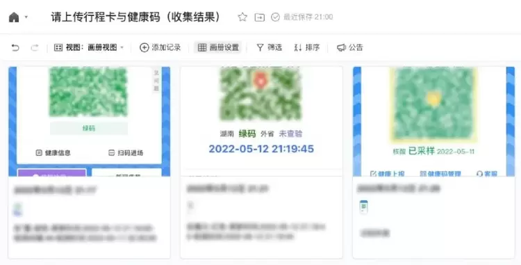 尤其在关联收集表结果时,由于智能表可对文本、图片、文件等多类型数据进行更友好的视觉展示,防疫工作者可以在统计健康信息后,通过智能表的「画册视图」,一眼辨认收集结果。