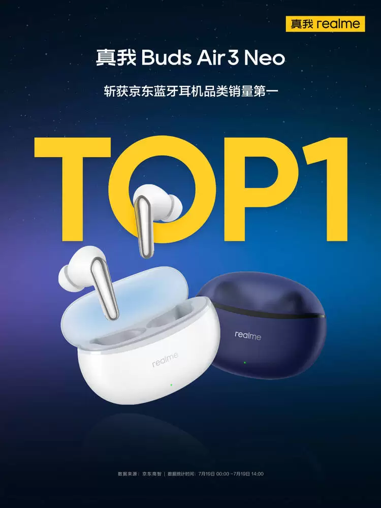 7月19日,科技潮牌真我realme发布了两款AIoT新品的首销战报,其中真我Buds Air3 Neo斩获京东平台蓝牙耳机品类销量第一,真我笔记本Air斩获京东2500-3000价位段轻薄笔记本销量第一。