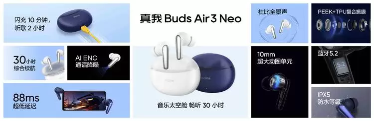 作为价位段首款入耳杆式TWS耳机,以及价位段续航最强的TWS耳机,真我Buds Air3 Neo的单只耳机仅重约4克,打造轻巧零压感的佩戴体验,兼具舒适度和好音质。同时,真我Buds Air3 Neo采用10mm低音大动圈,支持杜比全景声、AI ENC通话降噪,88ms超低延时,配以30小时长续航,让你在日常通勤或者长途旅行时都不用担心电量问题,随时随地享受影院级的听感体验。有用户表示,真我Buds Air3 Neo续航长,音质好,是听歌、追剧、打游戏的必备良品,值得推荐!