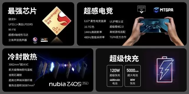 为打造超感电竞体验,努比亚Z40S Pro搭载超大尺寸X轴线性马达,大幅提升手机振感。DTS:X® Ultra,立体双扬声器,带来现场级音质享受。努比亚独有的超级稳帧2.0技术,可有效提升游戏帧率稳定性、降低系统功耗。电竞级柔性直屏为游戏而生,支持144Hz屏幕刷新率和480Hz智能采样率,触控响应更快、竞技走位更到位。5000mAh超大电池和80W快充组合,配合灵犀智能省电技术,让手机超长在线、瞬间满血。新机还提供了120W超级快充+4600mAh电池版本选择,电量从0充到100%只需约19分钟。
