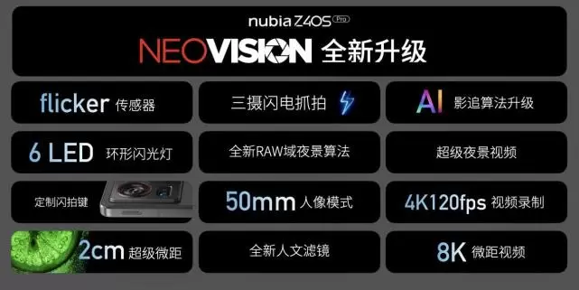 三摄全部支持闪电抓拍,自适应快门影追算法再次升级,挑战业界最快抓拍速度,加上预设对焦功能,轻松定格最好瞬间。人文影像上,努比亚Z40S Pro提供50mm模式,人像拍摄更进一步,人文画质和肤色保护还原真实影像色彩,全新人文滤镜、布列松滤镜、胶片滤镜等还为用户提供了丰富多样的滤镜选择。努比亚Z40S Pro支持原生4K 120帧视频拍摄,超级夜景视频采用全新RAW域夜景算法,增强暗区解析力和动态范围,夜景视频表现更加出色。