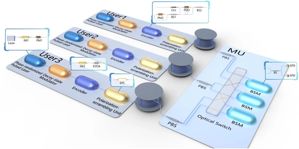 在本研究中,课题组设计了“萨格纳克-马赫-曾德尔”结构的非相敏量子编码器,能够免除相位参考系的补偿;同时,课题组借助随机化,擦除了编码量子态的偏振信息,使其具备抗信道偏振扰动能力;最后,课题组重新利用偏振维度进行多用户配对,能够同步实现多对用户的Hong-Ou-Mandel干涉和联合测量。在此基础上,课题组完成了测量设备无关量子密钥分发网络的构建,使其同时具备抗环境干扰、无需可信节点、支持多用户灵活组网的特性。该成果推动了下一代量子保密通信网络的实用化,为未来量子互联网的具体形态做出了有益的探索。