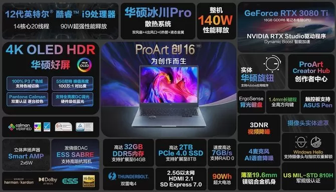 华硕ProArt 创16 2022在性能水准、硬件加速、创意工具、屏幕素质等方面均有非常出色的表现,能为创意设计师们带来更为丰富的创作体验,7月21日正式开售,i9-12900H处理器+RTX 3070 Ti+2.5K 120Hz IPS屏到手价13999元。此外,华硕还推出搭载4K OLED华硕好屏+i9-12900H处理器+RTX 3080 Ti顶级配置组合首发价格29999元,专为高阶玩家打造。