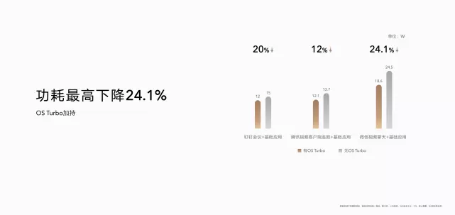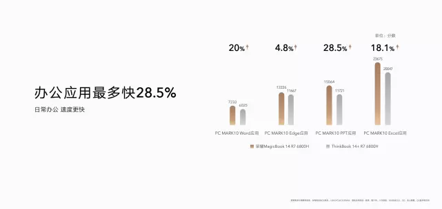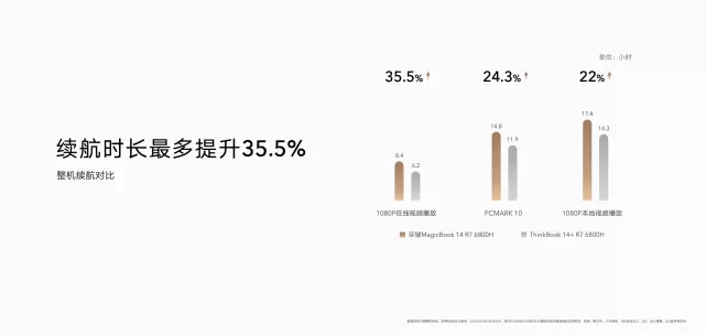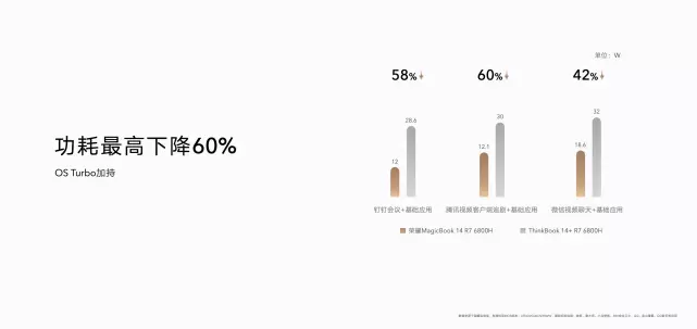 OS Turbo作为荣耀自研的系统级性能和功耗优化引擎,可以实现同样的场景性能更优、功耗更低。从笔记本的实际使用场景来看,有着OS Turbo加持的荣耀MagicBook 14 锐龙版在钉钉会议、腾讯视频追剧、微信视频聊天等日常应用场景下最高功耗可下降24.1%,相较同类型产品,最高功耗下降60%;当使用PC MARK10 Word、Edge、PPT、Excel等日常办公应用时,响应速度最多快28.5%;同时1080P在线视频播放、本地视频播放以及PC MARK10等多场景应用下,整机续航时长最多提升35.5%。