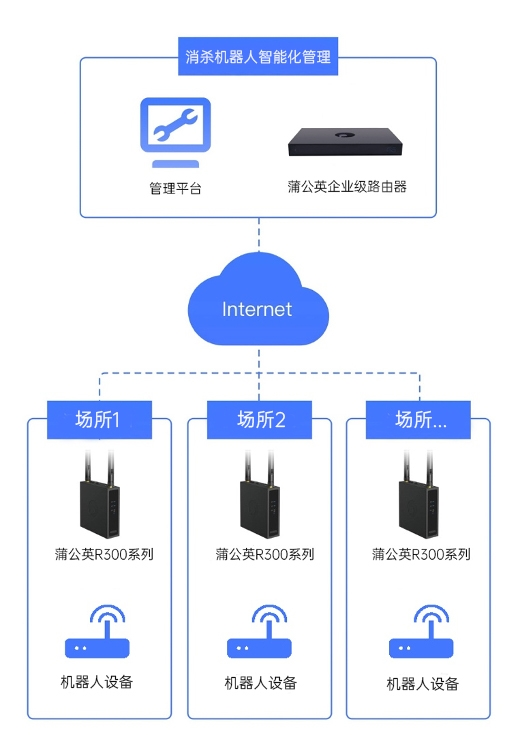 国内某家智能消杀机器人供应厂商当前正有改善机器人设备运维方式的需求,考虑到其设备产品多分布式的实际情况,他们选择与国内远程连接SaaS服务商贝锐旗下蒲公英智慧网络展开合作,引入蒲公英自主研发的智能组网技术,为其提供基于远程连接技术的智慧网络解决方案。搭配内置智能组网功能的蒲公英R300系列4G工业无线路由器使用,可在运维管理系统与各个机器人设备间建立虚拟局域网络,以此实现异地互联互通,达到机器人设备可远程运维智能化管理的目的。