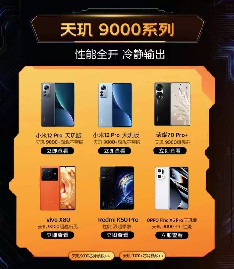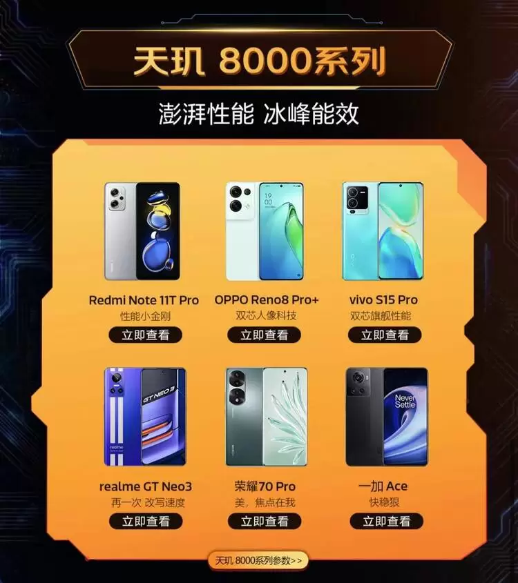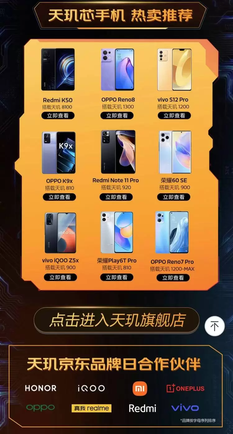 此外,本次活动中还有来自荣耀、iQOO、小米、一加、OPPO、真我Realme、Redmi、vivo(品牌按字母序列排序)手机品牌搭载天玑9000系列、天玑8000系列等芯片的热门旗舰手机供消费者选择。