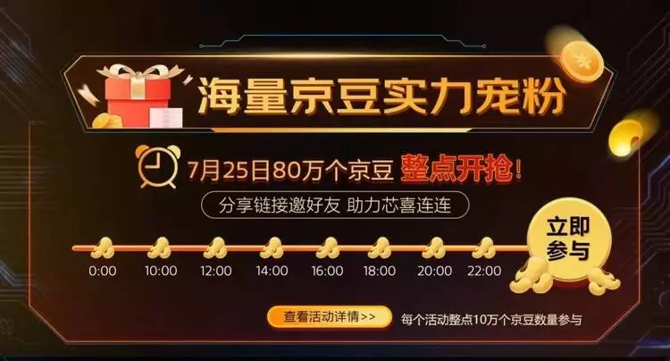 7月25日,联发科“天玑京东品牌日”还将带来80万个京豆整点开抢活动。当日0:00、10:00、12:00、14:00、16:00、18:00、20:00、22:00八个时段,每个时段都有10万个京豆在线发送,福利多多,拼的就是手速!
