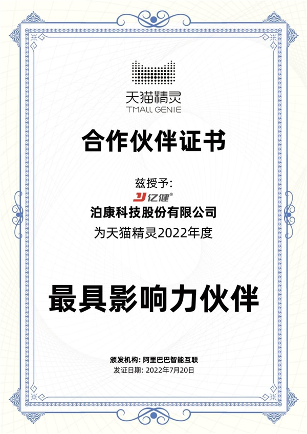 7月20日,阿里巴巴智能互联为亿健(泊康科技股份有限公司)授予合作伙伴证书,亿健成为天猫精灵2022年度最具影响力伙伴。
