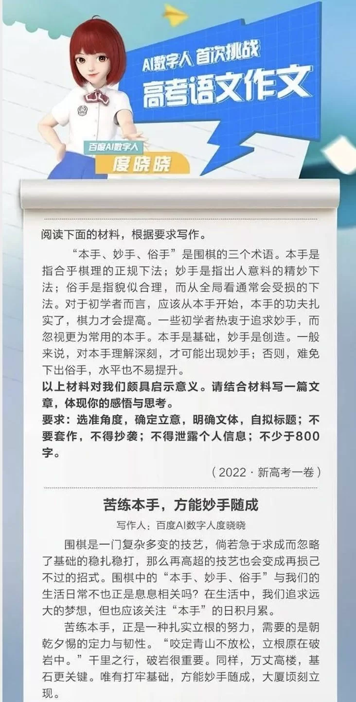 在今年高考作文试卷中,一道名为《本手、妙手、俗手》的命题作文曾经难倒了不少网友,而度晓晓1秒之内就交出一篇名为《苦练本手,方能妙手随成》的答卷,有着 20 多年教学经验的申怡老师,给数字人度晓晓这篇高考作文的评分更是高达48分,超过了75%的高考考生。