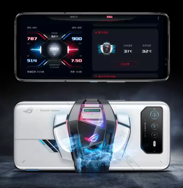 在SoC全速运行时,良好的机身散热设计往往可以让操作与体验更上一层楼。ROG6采用的矩阵式液冷散热架构6.0,拥有增大面积的双层石墨烯、真空均温板作为导热层,同时在内部注入3300mg氮化硼冷凝材料,居中式SoC放置设计让热量导出更迅速,配合ROG酷冷风扇6,降温效果更显著。