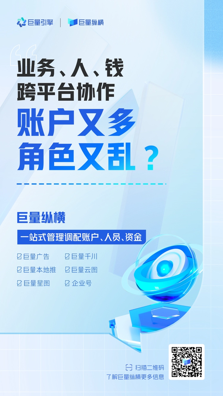 针对这些难点,巨量引擎打造了商业生态中枢——巨量纵横。作为面向商业化客户的综合性营销与经营管理平台,巨量纵横已整合打通巨量广告、巨量千川、巨量本地推、企业号、巨量星图、巨量云图等巨量引擎生态内的产品账号数据与资产,覆盖全局管理、营销经营、数据洞察、资产管理四大经营场景。截至2022年7月,已为15万+企业的营销经营工作提供了资产、数据、资金、人员智能化管理的全链条解决方案。