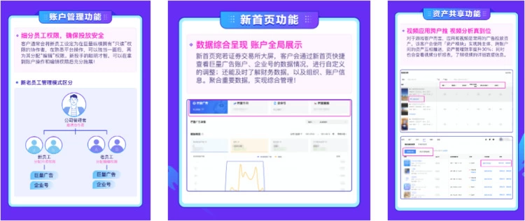 为填补不同平台的“分裂感”,巨量纵横实现了账户、人、钱的统一管理,相当于有一个“超级管理员”,打破了账号与平台的壁垒,让管理者能站在全局视角,进行一站式管理经营。超级管理员可以根据具体身份,为协作者分配账户及权限;即使跨账户,也能顺畅地实现资金转账、充值、退款、流水管理等操作。