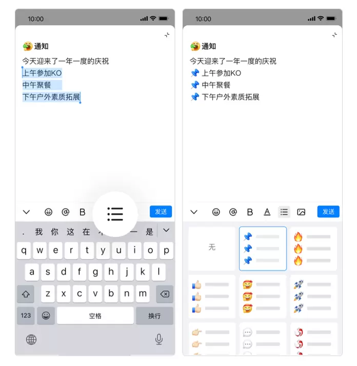 钉钉聊天富文本中还新增了表情列表符号。此前,不少用户就很喜爱钉钉的全屏化富本文编辑功能,插入表情符号后,用户可以对文字进行结构化的排序,让关键信息更为突出。