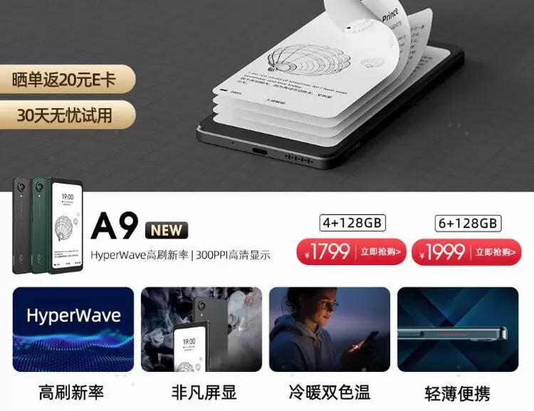 针对普通的墨水屏产品刷新速率较低的问题,海信阅读手机A9还自主研发了HyperWave超波型显示引擎,显示对比度较上一代提升12%,屏幕刷新率最高提升33%,确保用户获得更接近纸质书的阅读体验。