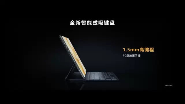此外,智能磁吸键盘还拥有磁吸笔套、1.5mm高键程,15mm大键帽、隐藏式悬浮天线等全新设计。磁吸笔套卡扣于华为logo凸起金属名牌处,为手写笔提供了功能性的磁吸笔套定位及卡扣功能;1.5mm高键程,15mm大键帽使输出更流畅自然;隐藏式悬浮天线使用Enhanced Signal 1.0天线增强技术,键盘在平板吸附状态下,平板网络信号大大增强,可以说华为MatePad Pro配上磁吸键盘就相当于增加了一个信号增强系统,随时随地都可以享受到更好的网络信号覆盖。