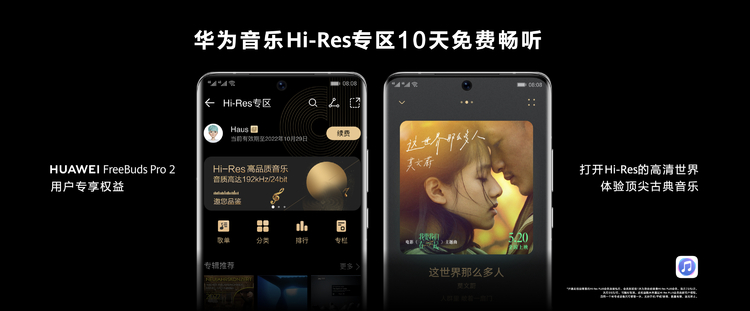 凡是购买华为FreeBuds Pro 2耳机的用户,都将获得华为音乐提供的价值100元的新用户礼包,以及华为音乐Hi-Res专区10天免费畅听权益(全国40万份,先到先得),耳机包装盒内将附赠一张音乐权益卡片,扫描卡片上的二维码即可领取。听众不仅能畅听千万正版曲库和索尼精选等顶尖Hi-Res高解析音乐内容,还可自由聆听由TOP级有声内容服务商提供的亿级有声内容,获得全方位、多元化的高品质聆听体验。