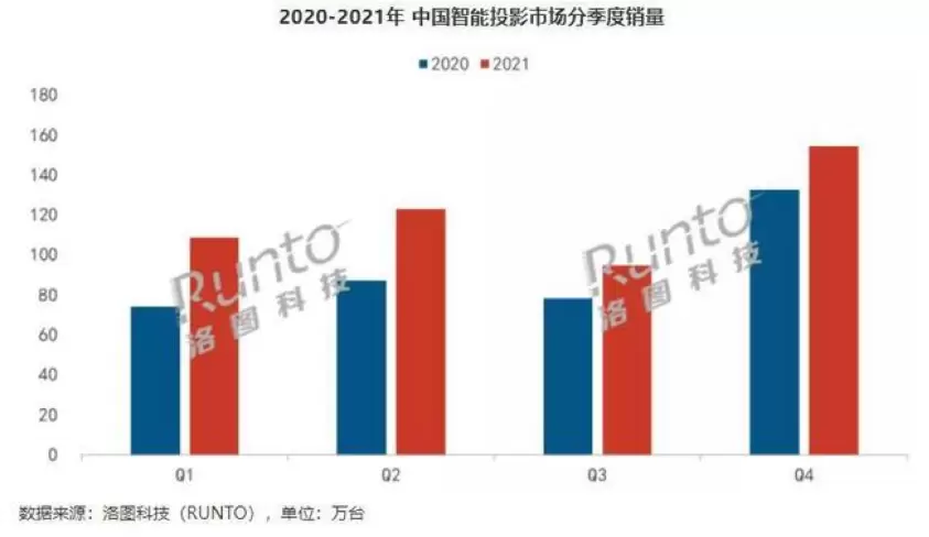 近年,在“宅经济”背景下,投影仪市场的需求在家庭娱乐终端不断攀升,市场规模也实现快速增长。据洛图科技(RUNTO)数据显示,2021年中国智能投影市场销量达到480.3万台,同比增长29%,市场销售额达到116.1亿元,同比增长32.2%。