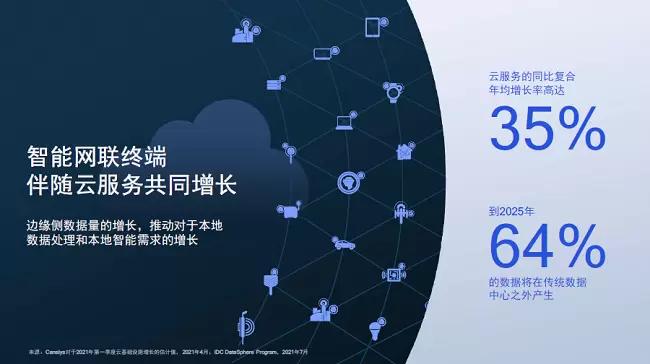 同时,5G还与人工智能、云等加速融合,更多终端可实时连接至云端,加快行业数字化转型。预测数据显示,到2025年,64%的数据将在传统数据中心之外产生,意味着对本地数据处理和智能应用的需求将进一步增长,智能网联终端正迎来广阔的机遇。高通在移动领域具有领先优势,正利用面向移动和智能网联边缘的关键技术,包括AI、影像、图形、处理、连接等等,为各类终端设备赋能。