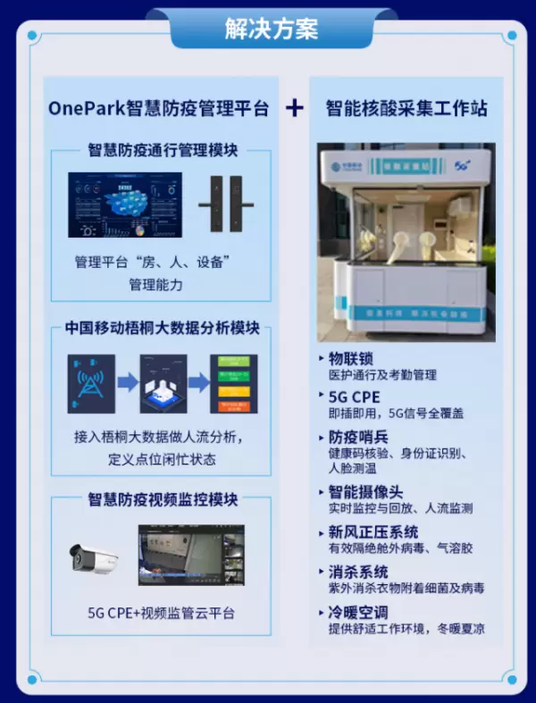 据了解,中国移动OnePark智慧防疫小站搭载数字孪生、AI、大数据等物联网技术,整合可视化数据后台、智能监控、智能门锁等一系列智能终端,能够实现一屏掌控全区核酸动态、检测人员智慧化排班、采集亭忙闲引导、智能人码对比防代检、智慧化资产管理与防盗、设备联网管理运维,联合打造安全、完善的核酸检测环境与流程,进一步优化常态化核酸检测采样方式,可在集中采样点、社区、车站、商超、学校等场景完成分布式、网格化落地安装,实现快速部署,多点运行,让有检测需求的群众少跑路,享便利。