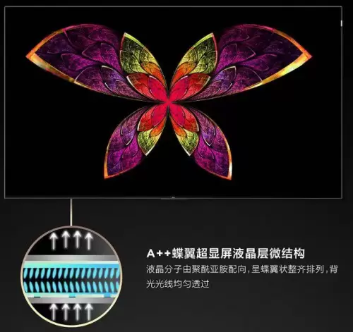 纳米级仿生科技的运用是TCL C11 QLED电视的一大亮点,通过使用前沿仿生A++蝶翼超显屏,使得原本杂乱的液晶分子呈蝶翼状整齐排列,有效提高色域、对比度、可视角度等,起到观看画面时候的防眩光与去光晕效果,让屏幕画质得到了更进一步的提升,让视觉效果拉满。