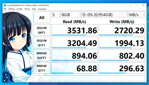 在性能表现上,通过软件测试,硬盘显示连续读取速度在3531.86MB/s,连续写入速度在2720.29MB/s,4K随机读写也水平在线,秒速开机,高速传输,多个程序同时作业也不会卡顿,切换自如,一心两用不是问题。