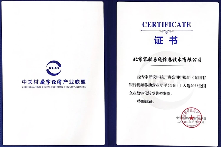 会上,中关村数字经济产业联盟副理事长兼秘书长常义发布《2022全国企业数字化转型典型案例报告》蓝皮书,蓝皮书对中国企业数字化转型实践典型案例和经验成就进行了深入剖析和梳理总结,容联云凭借助力某国有银行打造视频移动营业厅项目,入选2022全国企业数字化转型优秀案例蓝皮书。