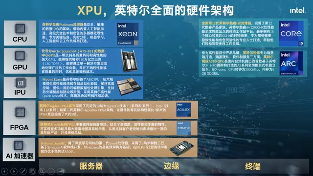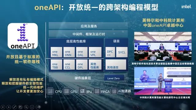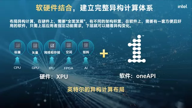 宋继强表示,建立完整的异构计算体系需要软硬件结合,在硬件上,需要“全面发展”,有不同的架构积累,在软件上,也需要有一套方便且好用的软件,只需上层应用者指定功能需求,下层就可以随着异构变化。具体到英特尔自身的异构计算布局,表现为“XPU+oneAPI”,既有非常全面的硬件架构布局,覆盖从终端到边缘再到服务器,在 CPU、GPU、IPU、FPGA、AI 加速器等领域,都有具有代表性的成熟产品,又有 oneAPI 这一开放统一的跨架构编程模型,让现有的和未来将出现的新硬件都能很好地发挥能力。oneAPI 也在全球积极开展各项合作,去年还和中科院计算所联合建立了中国首个 oneAPI 卓越中心。