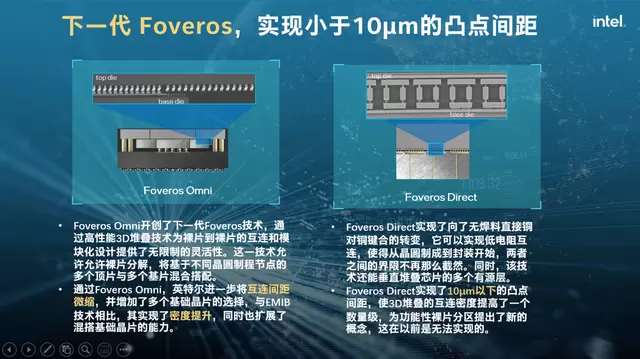 宋继强进一步补充,Foveros Omni 和 Foveros Direct 是英特尔在 3D 封装上未来会使用的两种技术。在上面是一个大的芯片,底下是几个小芯片的时候,Foveros Omni 可以把不同芯片之间互连的接触点间距微缩到 25 微米,同时还可以通过封装边上的铜柱直接给上层芯片供电,和 EMIB 相比有接近 4 倍的密度提升。Foveros Direct 则通过一种更高级的不需要焊料、直接让铜对铜键合的技术,实现更低电阻的互连,进一步缩小凸点间距到 10 微米以下,将整个互连的密度提升到新的数量级。