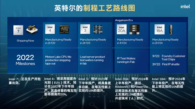在路线图方面,英特尔计划在四年内推进五个制程节点:Intel 7 已经开始批量出货;Intel 4 将于今年下半年投产,采用 EUV 技术,将晶体管的每瓦性能将提高约 20%;Intel 3 将于 2023 年下半年投产,在生产过程当中会更大量地使用 EUV,在每瓦性能上实现约 18%的提升;Intel 20A 预计将于 2024 年上半年投产,通过 RibbonFET 和 PowerVia 这两项技术在每瓦性能上实现约 15%的提升;最后,Intel 18A 预计将于 2024 年下半年投产,在每瓦性能上将实现约 10%的提升。宋继强表示,目前英特尔在 Intel 18A 和 Intel 20A 上都取得了不错的进展。