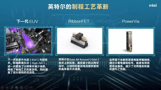 宋继强表示,英特尔的制程工艺革新主要包括以下三大技术:在工具上,英特尔将自 Intel 4 开始使用下一代基于高数值孔径的极紫外光刻机(EUV)技术,降低整个制程工艺的复杂度,提高良率;在晶体管结构上,Intel 20A 将使用全新的 RibbonFET 结构,进一步降低平面上晶体管所占面积,同时可以有更快的驱动速度,也增加驱动电流的强度;在供电层面,Intel 20A 同样将启用全新的 PowerVia 技术,实现底部给所有上层功能逻辑部件供电,把供电层和逻辑层完全分开,从而可以更有效地使用金属层,大幅减少绕线和能量消耗。
