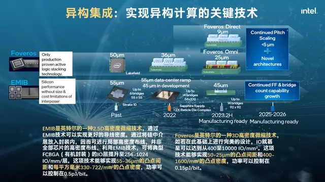 实现异构计算常常需要将不同制程节点的芯片封装在同一个大封装里,这时就需要应用异构集成,也就是先进封装技术,来满足尺寸、成本、带宽等方面的要求。宋继强介绍,英特尔在异构集成上主要有两项技术,2.5D 封装技术 EMIB 能把在平面上集成的芯片很好地连接起来,3D 封装技术 Foveros 则可以通过把不同尺寸的芯片在垂直层面上封装,进一步降低封装凸点的间距,提高封装集成的密度。