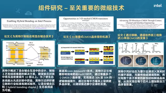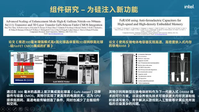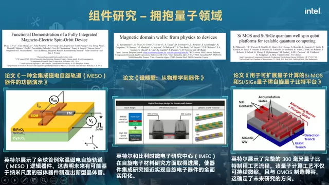 在组件研究上,英特尔的工作主要围绕三方面展开:第一,是提供更多的核心微缩技术,涵盖混合键合(hybrid bonding)技术、CMOS 晶体管 3D 堆叠技术和对晶体管新材料的探索;第二,通过叠加新的晶体管材料和结构,给硅晶体管注入新的功能,包括增强模式的高 K 氮化镓晶体管和硅 FinFET 晶体管的组合技术,以及反铁电体材料的嵌入式内存;第三,是量子领域的工作,包括应用在逻辑计算的磁电自旋电子器件,磁畴壁电子器件和 300 毫米量子比特制程工艺流程。