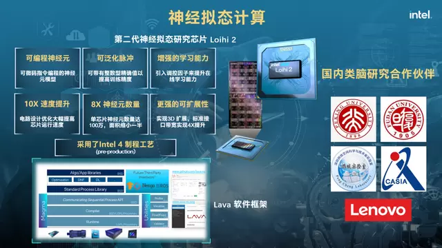 神经拟态计算可以直接模拟人类神经元的形式构造芯片底层的计算单元,再通过脉冲神经网络的方式编程实现人工智能算法,与传统上主要使用 CPU 和 GPU,靠堆乘加器的方式提供算力的模式相比,可以实现能效比千倍级以上的提升。宋继强介绍,目前英特尔的神经拟态计算芯片已经发展到了第二代 Loihi 2,基于 Intel 4 制程工艺,速度比上一代提升了 10 倍,单个芯片里的神经元数量也提升了 8 倍,达到 100 万。同时,英特尔也推出了一套完整的开源的软件框架 Lava 对神经拟态计算的开发提供全面支持,并和北京大学、复旦大学、鹏城实验室、中科院自动化所、联想等近 200 家国内外合作伙伴一起提升计算的效率。