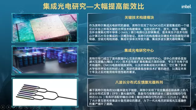 在集成光电上,英特尔则致力于大幅提高光电转换效率。在关键技术构建模块上,英特尔基于 CMOS 工艺,实现了在一个平台上集成所有的关键光学技术构建模块,包括光的产生、放大、检测、调制等等,大幅降低了尺寸和功耗;在器件层面,英特尔研制了一个集成在硅晶圆上的 8 波长激光器阵列,提升了准确性和能效比,为以后光电共封装和光互连器件的量产铺平了道路。此外,英特尔也继续和大学合作,在高速光互连、I/O 技术、性能扩展和节能方面做广泛的研究。