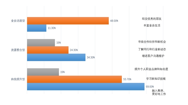 《报告》根据不同驱动因素将职场上的社交行为大致分为“自我提升型、资源整合型、业余消遣型”三类。大多数职场人希望通过职场社交融入集体、更好地开展工作(69%)、学习新知识和技能(55.7%)、跟优秀的人做朋友(48%);另有部分受访者希望通过职场社交增进日常与客户的沟通维系、了解同行情况和行业新动向、提升个人职业品牌与知名度、寻找合作伙伴和新工作机会;仅有11.3%职场人希望通过社交丰富业余生活、分享八卦与闲聊。
