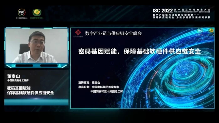 中国电科集团首席专家、中国网安和三十所副总工程师董贵山表示,针对芯片、操作系统和重要支撑软件、网络通信设施等基础软硬件的断供、停服、网络攻击,对关键信息基础设施、重要信息系统构成直接挑战,将影响到政治、经济、科技、文化等各领域安全。对此他提出了以“密码基因赋能,保障基础软硬件供应链安全”的思路,以“健标准、促创新、扩应用、强生态”的思路加强密码技术与软硬件的融合发展。
