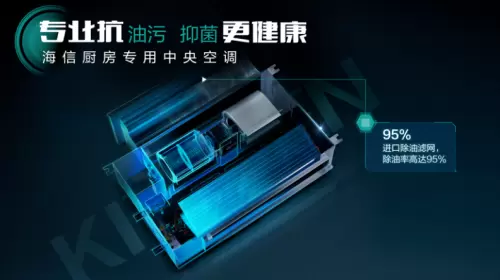在厨房,可以安装海信中央空调厨房专用机,这款针对厨房自研设计的产品,采用金属材质叶轮蜗壳,电机安装板加厚处理,更能防腐耐油,同时内置高效专用除油过滤网,能够实现95%的除油效率,以硬核实力减少油烟对空调的影响。