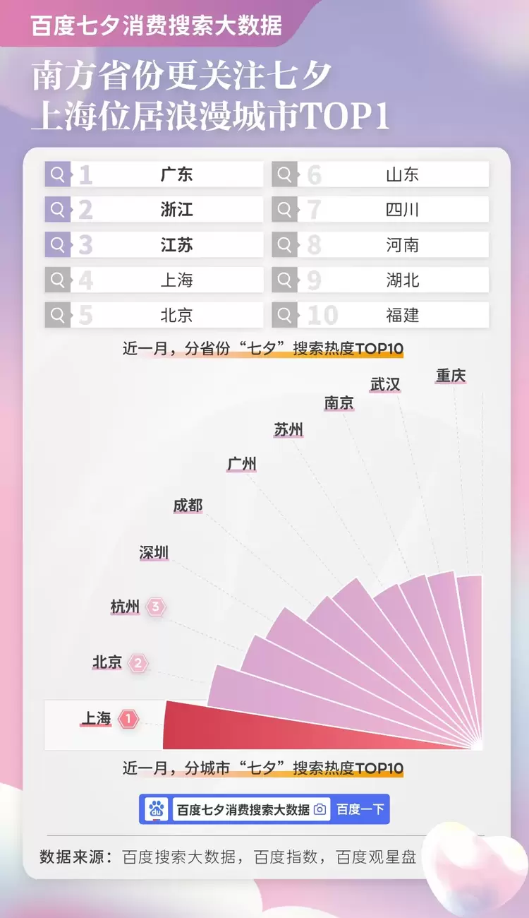 在七夕相关内容搜索中,南方省市的热度明显更高。百度搜索大数据显示,近一月,不同省份“七夕”搜索热度中,广东、浙江、江苏位列前三,长三角与珠三角地区人口众多,经济发达,面对浪漫机会总是“仪式感拉满”;当然,北方省市中,北京、山东与河南也入榜前十。具体到城市来看,北上广深对七夕“热情不减”,南方城市几乎包揽前十,既有“温润如水”的杭州、苏州等城市,也有“热情火辣”的成都、重庆等城市。