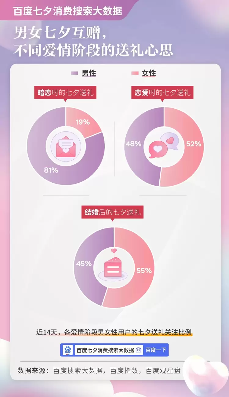 迎接浪漫佳节,消费需求也会上升。其中,自然包括了男女之间的传情达意。在礼物选购方面,百度搜索大数据显示,不同爱情阶段中的男女消费观呈现“大不同”。暗恋阶段的七夕礼物选购中,男性用户明显更积极,需求表达占比达到81%。当然,爱是两个人的经营,恋爱阶段,七夕送礼需求的男女用户比例基本相当;而婚后女性对七夕送礼需求会更加积极。
