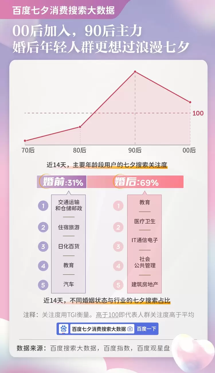 尽管第一批00后已经到了谈婚论嫁的日子,但百度搜索大数据显示,90后依然是七夕消费的主力,关注度位列各年龄段第一,00后也加入消费大军,年轻一代在七夕仍然最具消费活力。