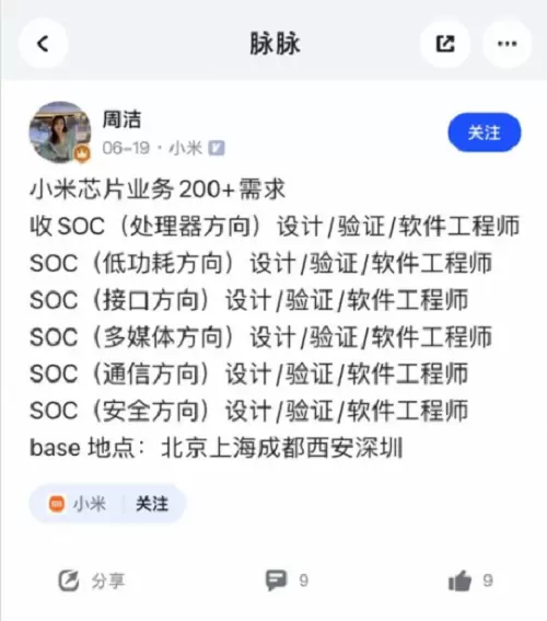 尤为认证为小米的脉友发布了小米芯片业务的招聘需求,表示需要200+员工,招聘方向涉及SOC(处理器方向、低功耗方向、接口方向、多媒体方向、通信方向、安全方向)设计/验证/软件工程师,工作地点涵盖众多一、二线城市。