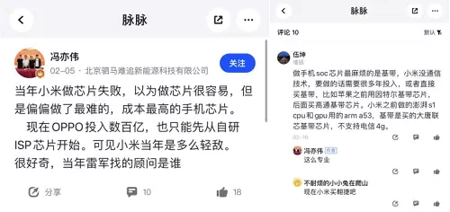有网友就从小米造芯的角度切入,表示当年小米造芯失败是过于轻敌,在手机核心硬件上手机芯片是技术难度最高,投入成本最高的。这位网友还补充道:“现在OPPO投入数百亿,也只能先从自研ISP芯片开始。”从这名网友的观点中不难发现,国产手机芯片的自研所需投入的高额研发成本。在评论中,另外一名脉友则表示:“做手机SOC芯片最麻烦的是基带,小米没有通信技术,要做的话需要很多年投入或者直接购买基带,比如苹果A系列Soc之前用英特尔基带芯片,后面买高通基带芯片。”