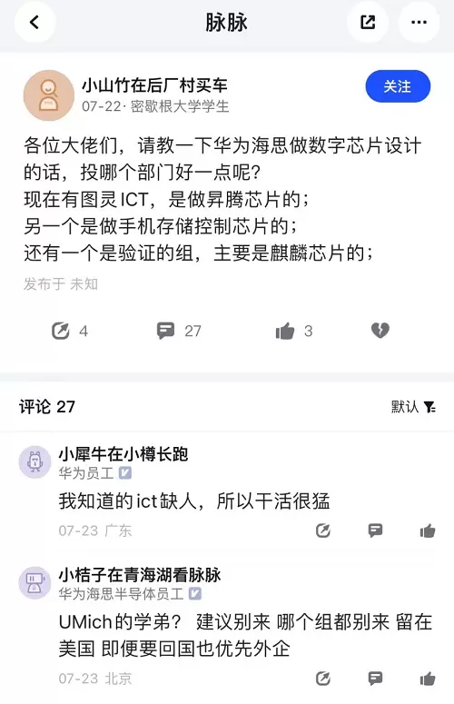 而对于想要入职华为海思从事芯片设计的毕业生,脉友们也给出了不同的建议。有网友表示“图灵ICT缺人,所以干活很猛”、“图灵ICT十一点下班不是很稀奇”、“整个图灵ICT都不轻松”,也有人建议“留在美国,即便要回国也优先外企”。