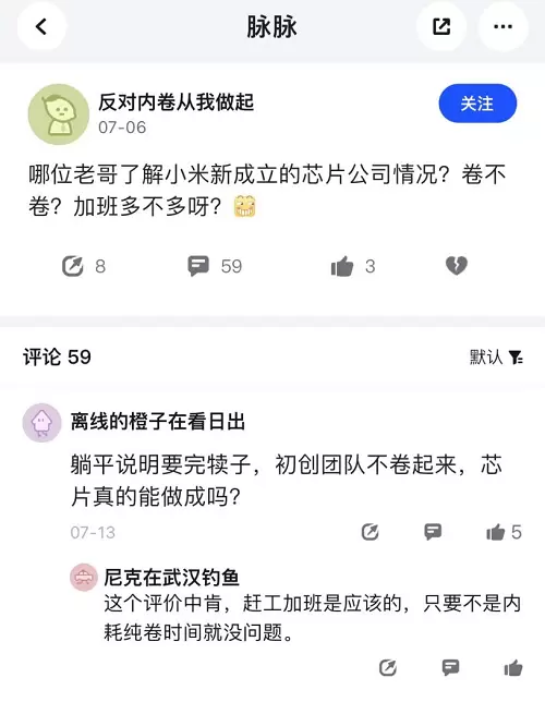 也有即将入职小米芯片的网友也在社区中询问公司的具体情况以及加班、内卷程度。对此,有网友就表示“躺平说明要完犊子,初创团队不卷起来,芯片真的做不成”,这个观点得到了不少人的认同,还有网友留言认为只要不是纯内耗纯卷时间就没问题;也有入职西安的网友表示“西安加班狂”。