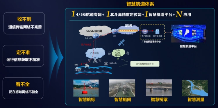 在广东,5G+北斗智慧航道创新应用项目依托5G、北斗高精度定位等新技术,创新打造智慧航道4G/5G+北斗通信专用网络、AI+北斗高精度定位+IoT航道精准感知网络和1个智慧航道平台,赋能航道业务理解、预测、决策及干预全流程,提升航道通行效率和行业数字化治理水平,推动传统航道向数字航道、智慧航道建设升级。