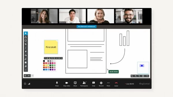 RingCentral Rooms的白板功能:RingCentral Rooms的白板功能允许用户与其他参与者共同创建和协作。无论他们是在会议室还是在家办公,都可以使用白板的沉浸式、近乎无限的画布,使用数字便签和形状可以轻松地注释和组织想法。